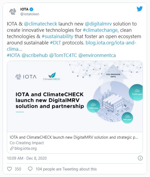 La Fundación IOTA anunció el 8 de diciembre que ha formado una asociación estratégica con la empresa de tecnología climática ClimateCHECK. Las dos entidades trabajarán juntas para crear soluciones para combatir el cambio climático y fomentar la sostenibilidad.