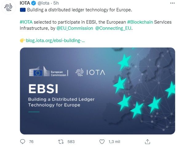 De acuerdo al anuncio publicado en la página oficial de IOTA, la Fundación IOTA ha sido seleccionada para participar en el proceso de licitación de la EBSI, una red de nodos de blockchain en la Unión Europea (UE).