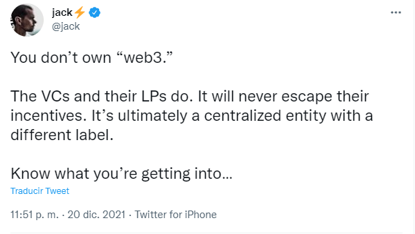 SponsoredLos últimos tweets de Dorsey, realizados en el transcurso de dos días, remarcaron que “el problema” era con los capitalistas de riesgo (VC, por sus siglas en inglés), no con los usuarios finales. Dijo que los inversores minoristas y los usuarios no son propietarios de Web3, pero sí los VC y sus socios limitados. Lo llamó: