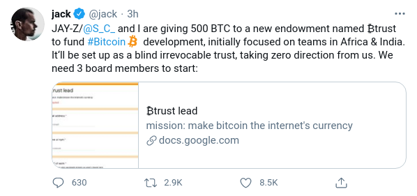 La donación de 500 BTC se centrará en el desarrollo de Bitcoin en África e India. Dorsey agregó al tuit un documento breve donde las personas pueden solicitar unirse como miembros de la junta, de las cuales se elegirán a tres.