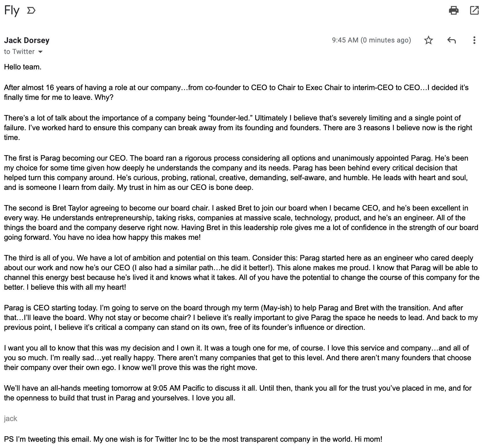 Jack Dorsey, el actual CEO de Twitter y Square, renuncia a su puesto liderando a la popular red social. Hace escasos minutos Dorsey publicaba su carta de dimisión confirmando que el anterior CTO de Twitter, Parag Agrawal, será el nuevo predecessor de Dorsey como CEO y que comenzará esta nueva labor desde hoy mismo.