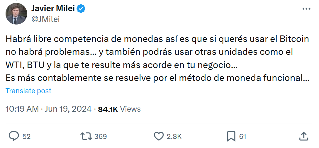 Sponsored“Habrá libre competencia de monedas así es que si querés usar el Bitcoin no habrá problemas… y también podrás usar otras unidades como el WTI, BTU y la que te resulte más acorde en tu negocio… Es más contablemente se resuelve por el método de moneda funcional”.