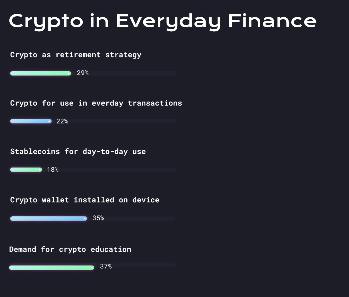 El informe también destacó las barreras para una adopción más amplia, con el 26.6% de los encuestados informando la necesidad de entender qué le da valor a una criptomoneda. También se hizo evidente una falta general de conocimiento sobre temas más avanzados como finanzas descentralizadas (DeFi) y staking.