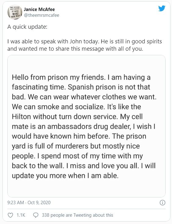 El día de hoy la esposa de John McAfee compartió un mensaje por parte de su esposo quien se encuentra actualmente detenido. Según palabras del mismo John McAfee, el influencer se muestra muy confortable en prisión y como siempre con un comportamiento relajado ante las autoridades y los detenidos.