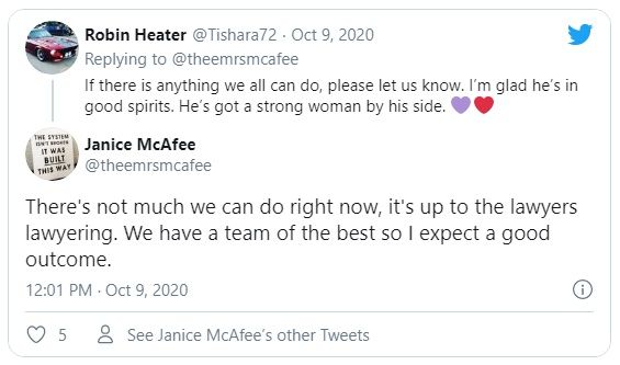 La esposa de McAfee, Janice, ha informado estos últimos días luego del arresto, que hasta los momentos el caso está siendo llevado por sus abogados personales y que por ahora no están precisando de ayuda externa alguna, y que si eso llegara a cambiar lo informará inmediatamente a través de las redes.