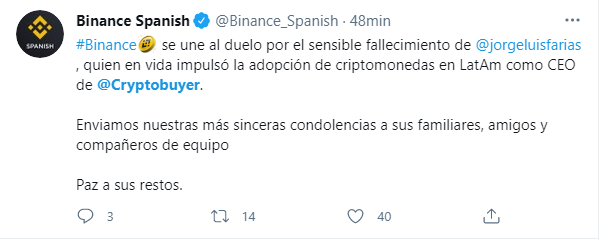 Binance, el mayor exchange de criptomonedas a nivel mundial, se sumó a los mensajes de condolencia ante la muerte de Jorge Farías: