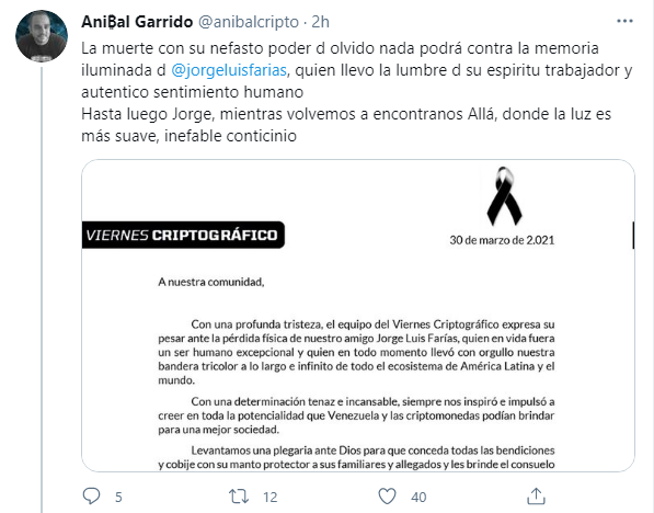 Aníbal Garrido, asesor/consultor en Cripto Finanzas y docente del Diplomado de Criptomonedas de la Universidad de Carabobo, específicamente como Instructor del Módulo de Cripto Trading, también se manifestó ante la triste noticia: