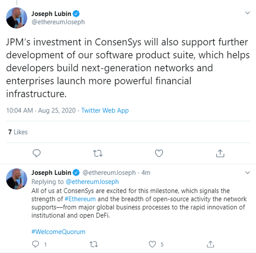 El fundador de ConsenSys, Joseph Lubin, explicó en Twitter que las hojas de ruta del producto de su “cliente compatible con mainnet, Hyperledger Besu”, convergerán con las del Quorum de JPMorgan. También promocionó una mayor “convergencia de nuevas empresas y grandes organizaciones en la red principal”, y agregó: