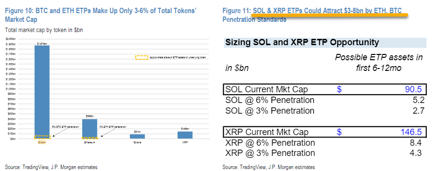 El jefe de investigación de JPMorgan, Matthew Sigel, estimó que una potencial aprobación de los ETP (Exchange Traded Product) de Solana (SOL) y Ripple (XRP) atraerían 3,000 y 8,000 millones de dólares cada uno. Especialistas han pronosticado al menos la probación de un ETF al contado en 2025.