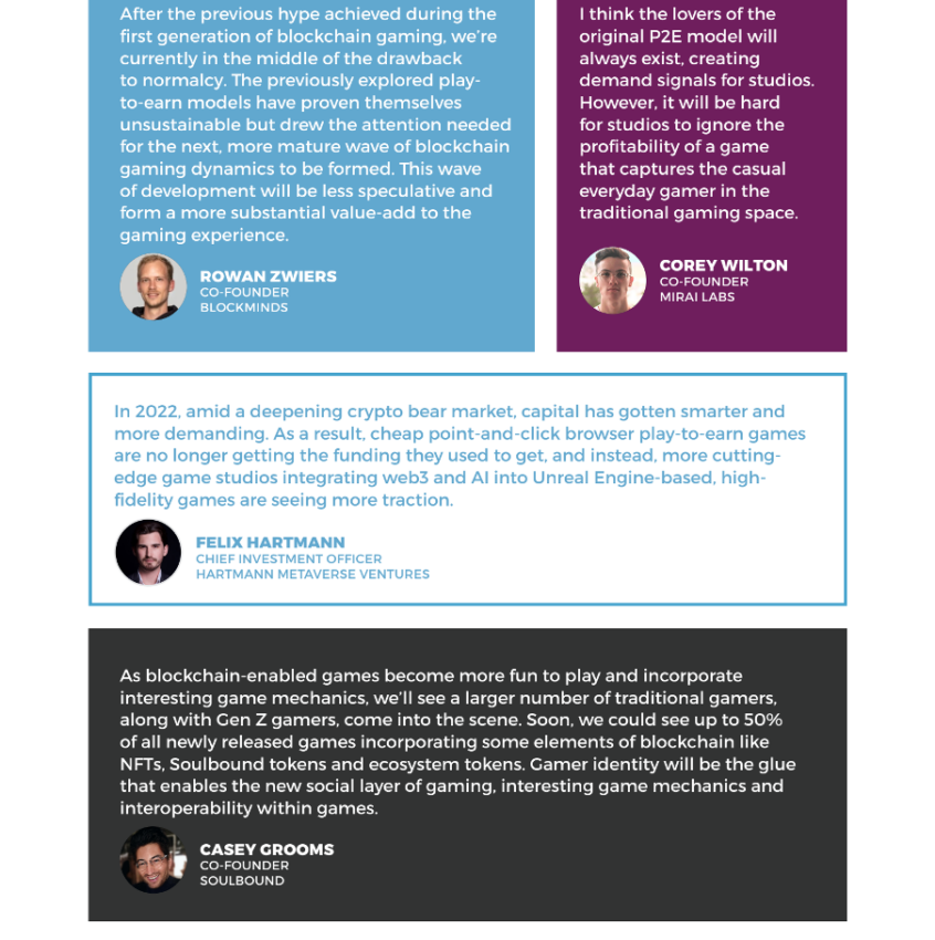 En cambio, el enfoque se ha desplazado a fomentar la experiencia de juego y hacer que la adopción de estos juegos se generalice. En 2022, el capital se volvió más innovador y exigente en medio de un mercado bajista de criptomonedas cada vez más profundo. Felix Hartmann, CIO de Hartmann Metaverse Ventures, afirmó: