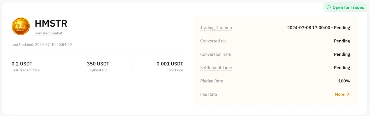 Aunque la fecha exacta para el evento de generación de tokens (TGE) de Hamster Kombat sigue sin confirmarse, importantes exchanges como Bybit lo han listado en la plataforma de Trading Pre-Market. Los datos de Bybit muestran que el precio base de HMSTR es de 0,001 USDT, con el último precio negociado a 0.2 USDT.