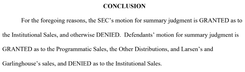 “Se CONCEDE la petición de juicio sumario de los demandados en cuanto a las ventas programáticas, las otras distribuciones y las ventas de Larsen y Garlinghouse, y se DENIEGA en cuanto a las ventas institucionales”.
