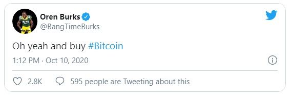 Burks, quien juega como linebacker de los Green Bay Packers, se ha apoderado de la fiebre de Bitcoin a medida que el precio de BTC se acerca al umbral de 12,000 dólares. Burks, hombre de pocas palabras, tuiteó a sus 24.000 seguidores en Twitter: “Oh, sí, y compra bitcoins”. Luego lo siguió con “temprano y con frecuencia”.