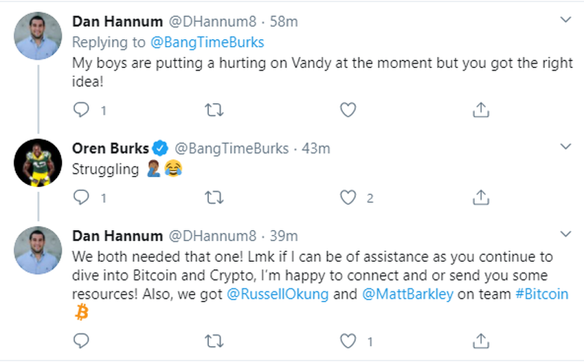 Además de Burks y Okung, el quarterback de la NFL Matt Barkley también está en el grupo de BTC. Barkley estaba buscando recibir su contrato de la NFL en Bitcoin, pero los equipos para los que jugó, incluidos los San Francisco 49ers y los Cincinnati Bengals, no cederían, según Anthony Pompliano de Morgan Creek Digital. Barkley ahora juega para los Buffalo Bills.