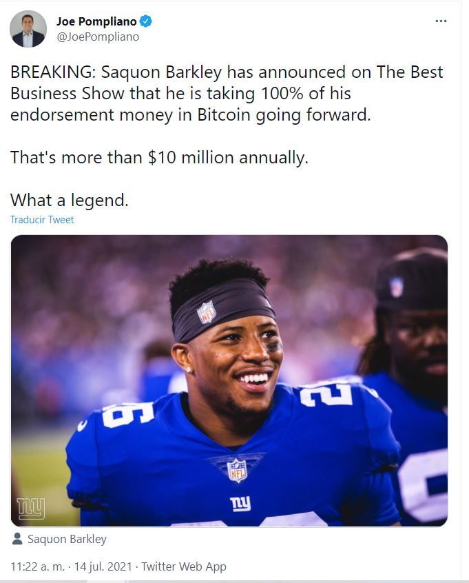 A través de su cuenta de Twitter, Joe Pompliano, aclaró que Saquon Barkley recauda anualmente 10 millones de dólares y ahora recibirá todo ese dinero en criptomonedas.