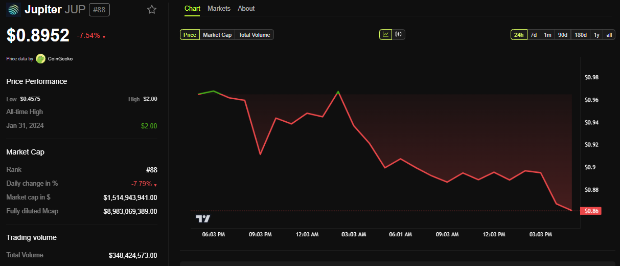 A pesar de las noticias sobre la reclamación del airdrop de Jupiter, el token JUP experimentó una disminución del 7.5% en el precio en las últimas 24 horas, negociándose a 0.89 dólares al momento de escribir esto.