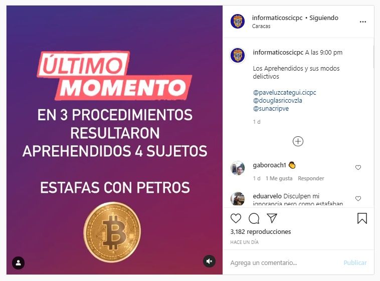 El día viernes 20 de noviembre la División Contra los Delitos Informáticos del CICPC anunció la detención de varios estafadores de criptomonedas de Petros. La noticia fue ofrecida a través de su cuenta oficial en Instagram.