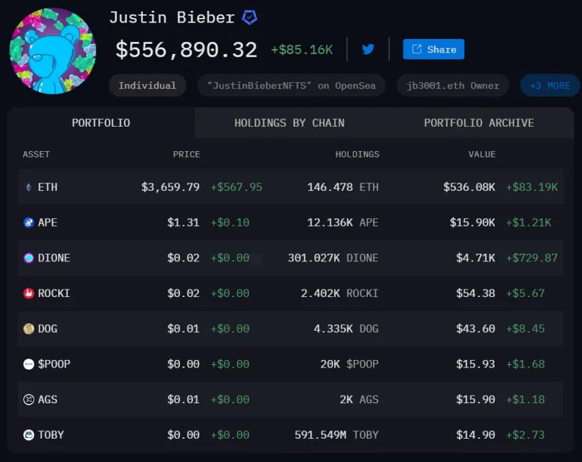 Otros holdings notables de Bieber incluyen ApeCoin (APE) y Dione (DIONE). Posee 12,136 APE y 301,027 DIONE, valorados en 15,900 y 4,710 dólares, respectivamente.