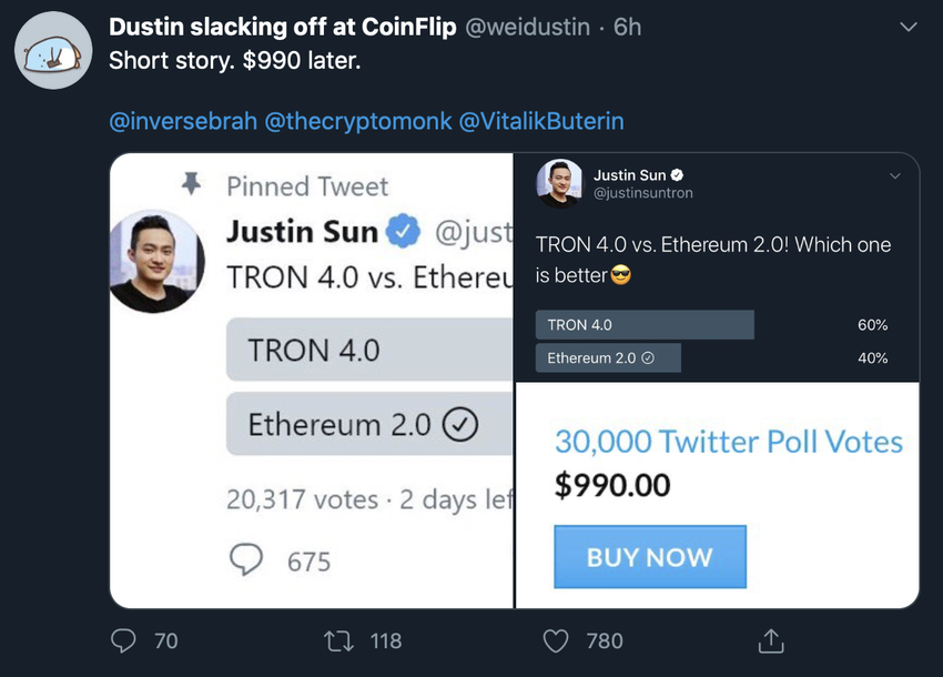 Muchos se dieron cuenta de lo que estaba pasando y comenzaron a acusar a Sun de comprar votos para influir en los resultados a su favor. El precio actual de 30.000 votos es de alrededor de 990 dólares, como señaló un usuario de Twitter (@weidustin). Eso no parece un buen uso del dinero de los inversores.