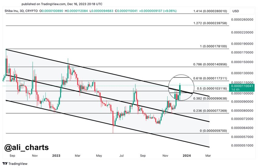 El analista de criptomonedas y jefe global de noticias de BeInCrypto, Ali Martinez, dijo que el precio de SHIB podría estar en proceso de lograr una ruptura: