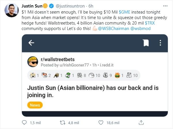 Después de una semana dramática en la que GameStop (GME) fue rescatada de una acción en apuros para convertirla en una empresa de la lista Fortune 500, el CEO de Tron, Justin Sun, ha prometido comprar acciones por valor de 10 millones de dólares.