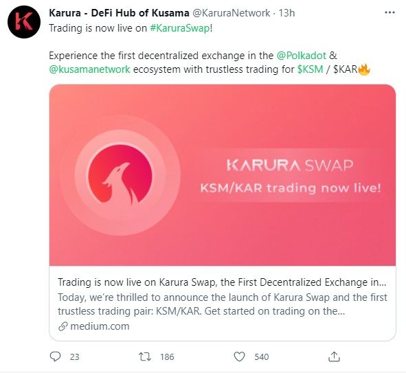 “Además, las tarifas de transacción en Karura ahora se pueden pagar en KSM gracias a la función Bring Your Own Gas y la liquidez del par KSM/KAR”.