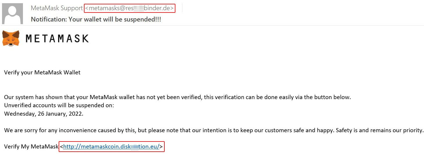 Sponsored“La estafa comienza con un email masivo que explota uno de los trucos favoritos de los cibercriminales: la intimidación. La amenaza es que, si las víctimas no verifican con urgencia su cuenta de MetaMask, esta será suspendida. Para que el mensaje parezca más convincente, le añaden el nombre y el logotipo de la empresa, e indican el servicio de soporte como remitente. Solo levanta sospechas al revisar con más detenimiento la dirección desde la que llega el mensaje”.