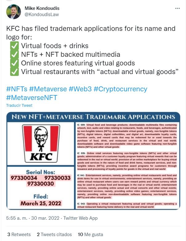 SponsoredLa noticia la dio el fiscal de la Oficina Nacional de Patentes de EE. UU (USPTO), Mike Kondoudis, a través de su cuenta de Twitter en la que informó que estas tres cadenas de comida rápida habrían aplicado para patentar su logo, marca, productos, sedes y NFT en el metaverso.