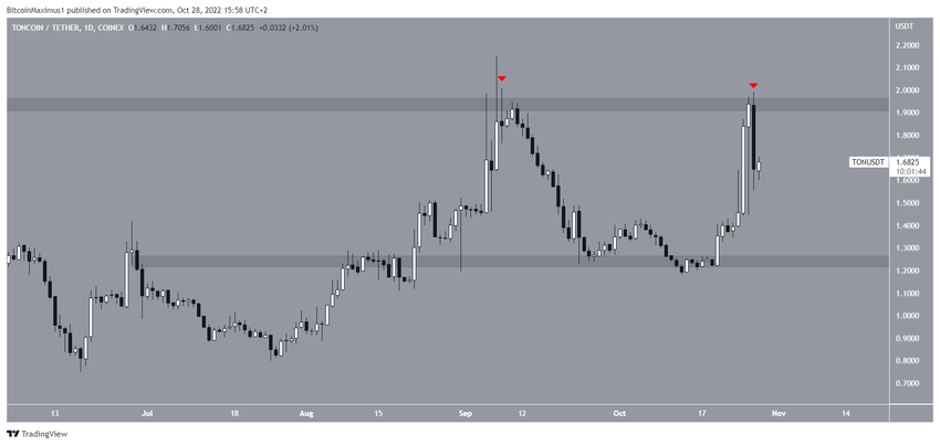 El precio de TON se ha estado moviendo hacia arriba a un ritmo rápido desde el 20 de octubre, cuando rebotó en el área de soporte horizontal de 1.25 dólares. Sin embargo, no logró salir del área de resistencia de 1.94 dólares, sino que creó un patrón de doble techo y una vela bajista.