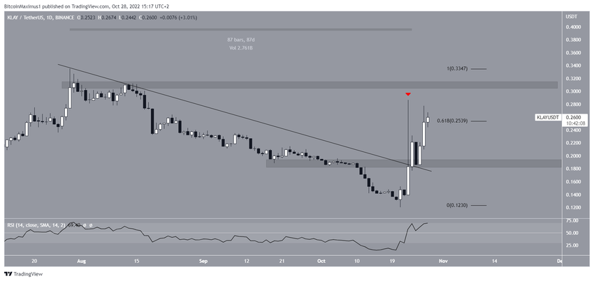 KLAY había estado cayendo por debajo de una línea de resistencia descendente desde que alcanzó un máximo de 0.334 dólares el 29 de julio. Después de dos intentos fallidos, el precio de KLAY salió de la línea el 24 de octubre.