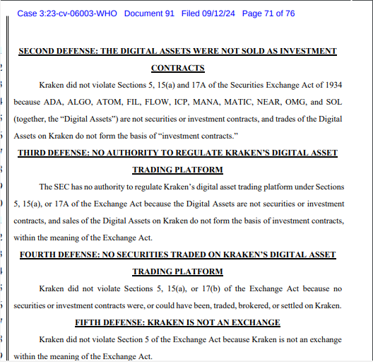 “La SEC no tiene autoridad para regular la plataforma de trading de activos digitales de Kraken […] porque los Activos Digitales no son valores ni contratos de inversión,” se lee en la presentación.