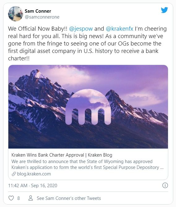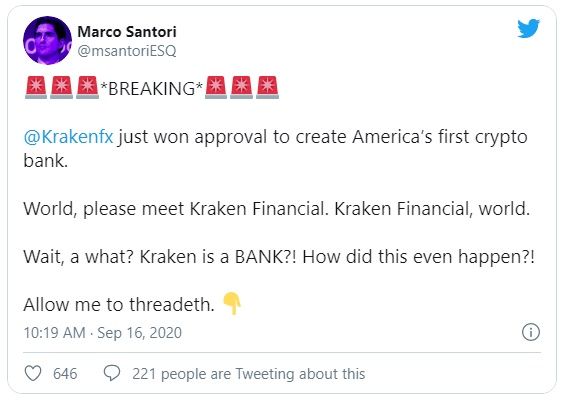 En un anuncio emitido a primeras horas del miércoles 16 de septiembre. Kraken reveló que la nueva institución, tentativamente llamada Kraken Financial, será una institución de depósito de propósito especial (SPDI, por sus siglas en inglés).