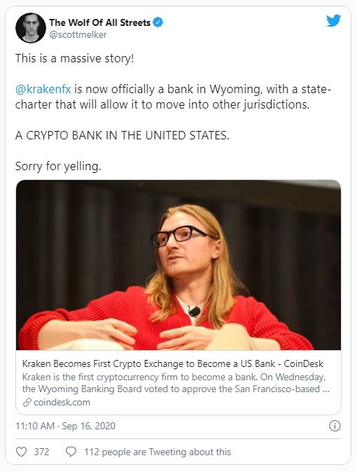 El Exchange de criptomonedas Kraken ha recibido la aprobación para formar el primer banco de criptomonedas totalmente regulado del mundo en el estado estadounidense de Wyoming.