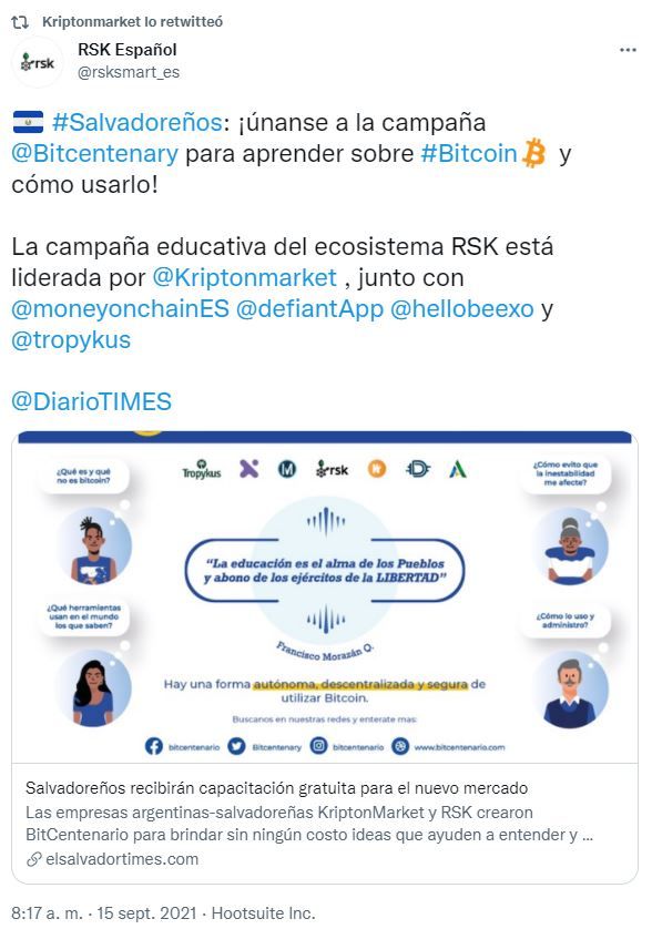 Kripton Market, en conjunto con RSK, crearon la iniciativa BitCentenario, con la que buscan capacitar a ciudadanos de El Salvador, para que aprovechen las funciones que les pueden brindar las criptomonedas, en especial Bitcoin, y el mercado que las rige.