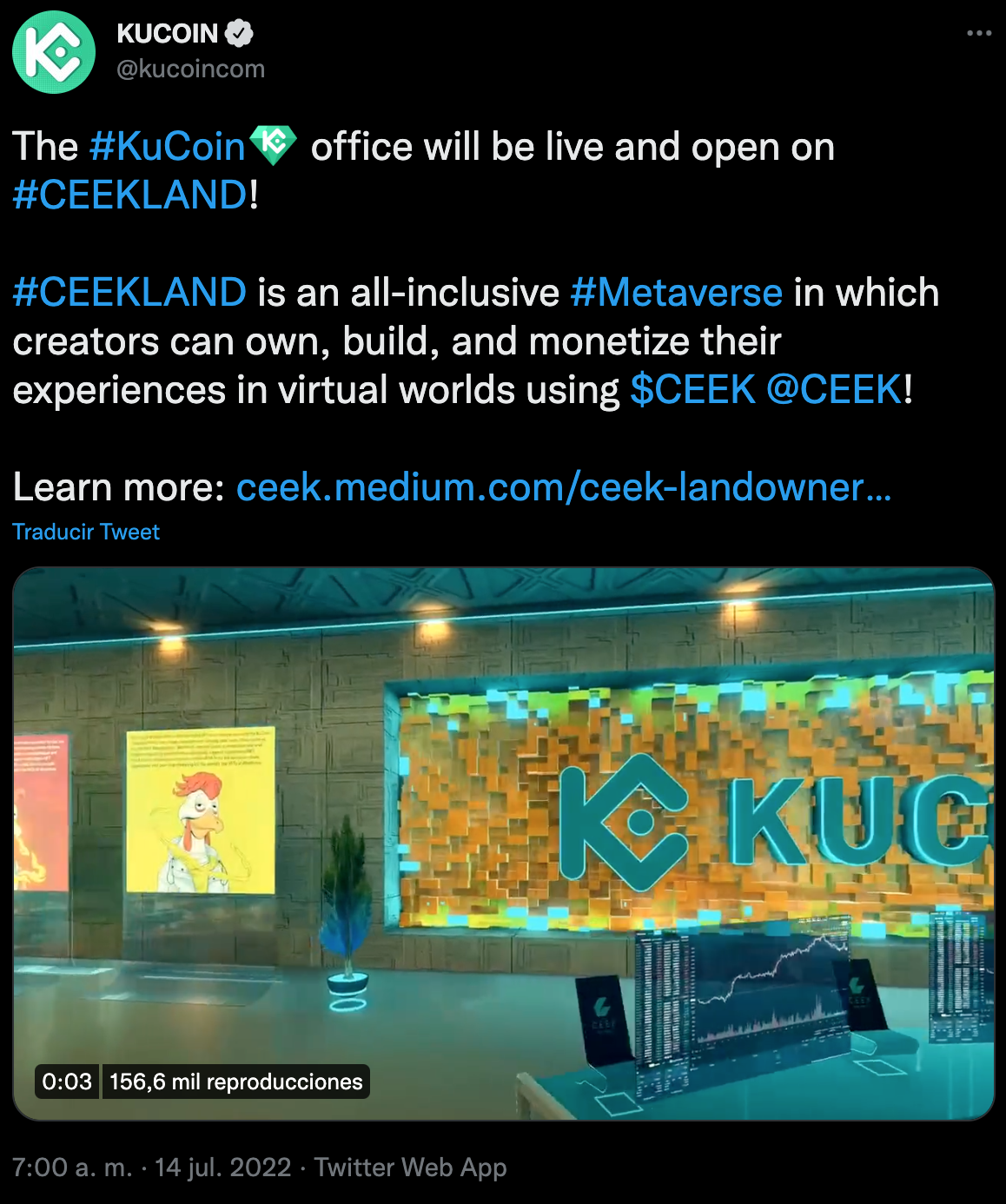 El exchange KuCoin anunció a través de sus redes sociales que abrirá una oficina en el metaverso CEEK. Este universo virtual permite a los creadores poseer, construir y monetizar sus experiencias en mundos virtuales usando $CEEK.