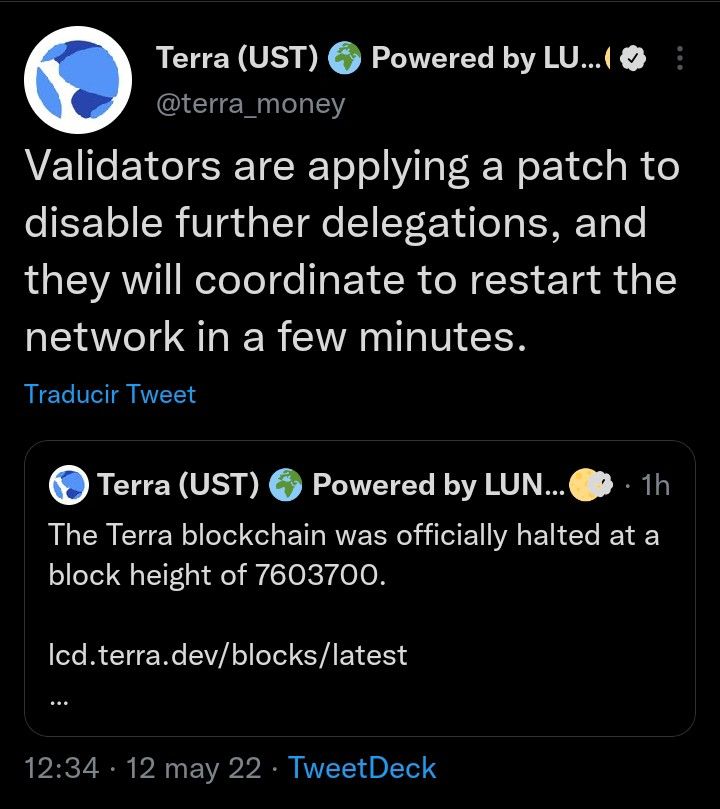 El equipo desarrollador de Terra (LUNA) anunció que la blockchain se ha detenido a la altura del bloque 7603700.