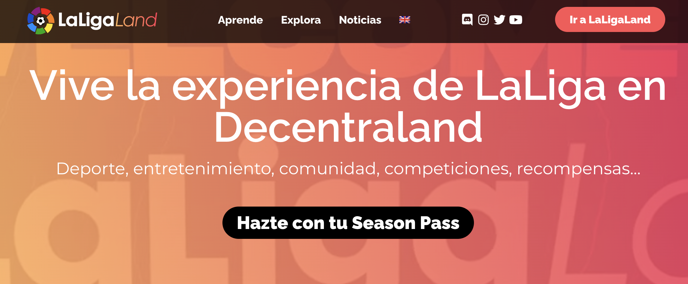 LaLiga, Stadioplus y Vegas City anunciaron el lanzamiento de su ecosistema deportivo “LaLigaLand” en el metaverso de Decentraland, con el que busca conectar a aficionados con el fútbol. LaLiga tiene a clubes como: FC Barcelona, Real Madrid, Sevilla FC y Atlético de Madrid.
