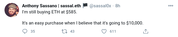 Anthony Sassano, defensor de Ethereum dijo que seguía comprando, incluso con precios altos: