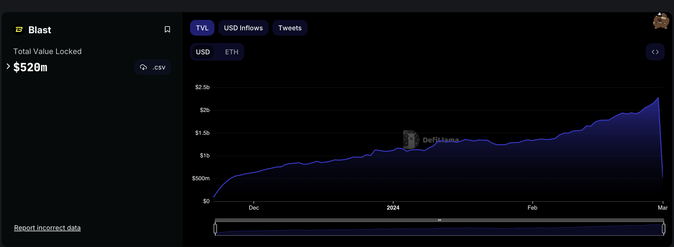 Datos de DefiLlama mostraron que tras el lanzamiento de la mainnet de Blast, el valor total bloqueado (TVL) llegó a 2,27 billones de dólares (su máximo histórico) para descender hasta 520 millones de dólares para el 01 de marzo. La red principal de Blast es uno de los lanzamientos más explosivos de los que se tenga registro en las Capas 2.