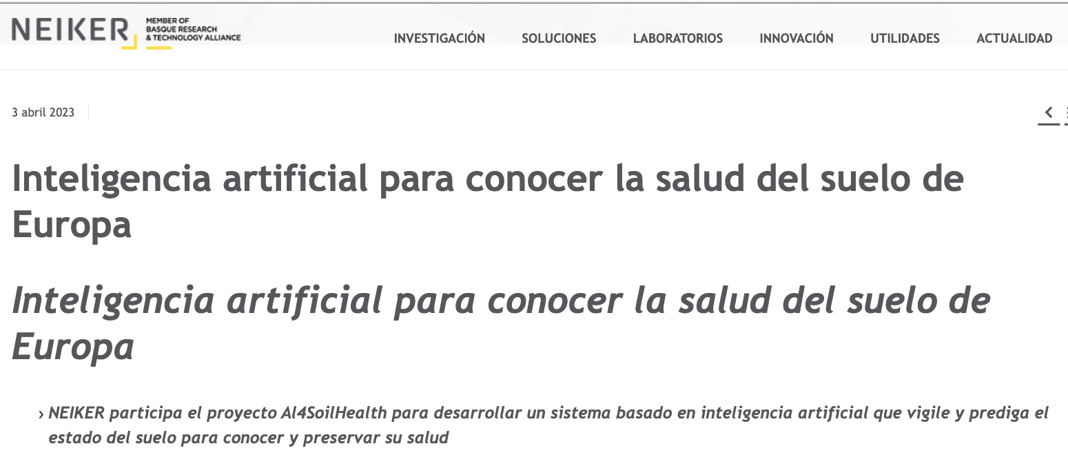 El Centro Tecnológico NEIKER, miembro de Basque Research and Technology Alliance (BRTA), está participando en el proyecto Al4SoilHealth. Este proyecto tiene como objetivo desarrollar un sistema basado en inteligencia artificial que permita vigilar y predecir el estado del suelo, con el fin de conocer y preservar su salud.