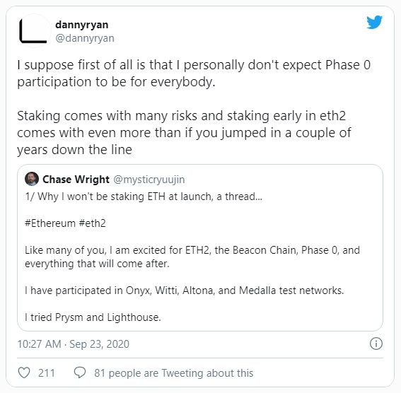 Danny Ryan respondió que Wright esperaba demasiado de una testnet. Se esperaban riesgos en la “Fase 0”, y Wright se estaba adelantando a los acontecimientos.