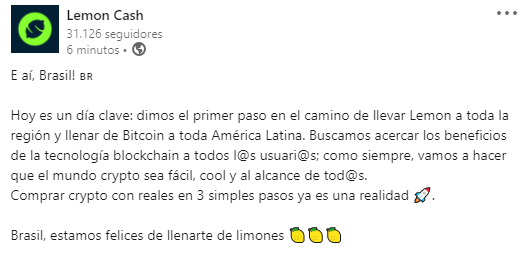 Para esto han contratado a una serie de personalidades del país para promover el uso de la aplicación. También abrieron una versión en portugués de su sección de Lemon Wiki, una en la que explican todo lo relacionado a la app y a las criptos.