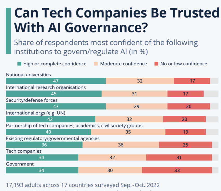 Mientras tanto, según Statista, en un estudio en el que se encuestó a más de 17,000 personas de 17 países, se descubrió que solo un tercio de los encuestados tenía una confianza alta o total en los gobiernos en lo que respecta a la regulación y la gobernanza de las herramientas y los sistemas de IA.