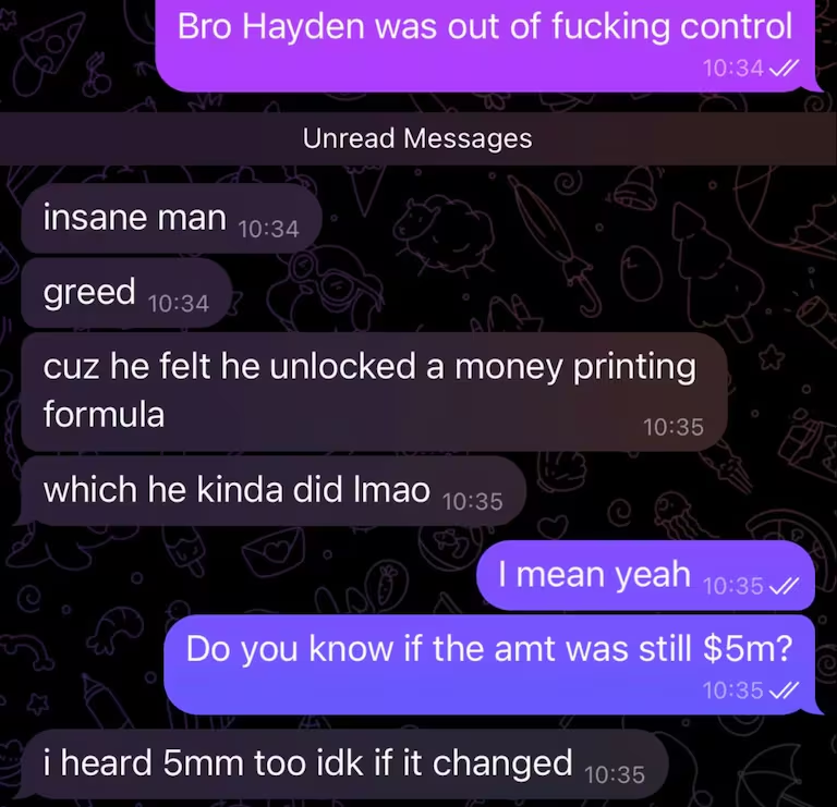 En otra de las filtraciones se muestran mensajes de un chat sobre Hayden Davis que expone “el bro Hayden estaba fuera de control” y en respuesta decía “hombre loco”, “avaricia”, e insiste en el scam “sintió (Hayden) que había desbloqueado una fórmula para imprimir dinero”, “lo cual hizo un poco”. La respuesta fue una pregunta “¿sabes si el monto todavía era de 5 millones de dólares” e incluso dudan si el monto aumentó “yo también escuché 5 millones de dólares, no sé si cambió”.