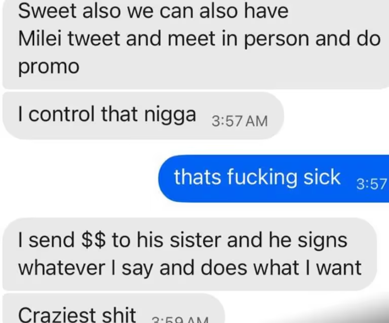 Nuevas filtraciones revelaron chats privados donde Hayden Davis presumía tener el control en las acciones de Javier Milei y su círculo cercano. En algunos mensajes escribió “también podemos hacer que Milei tuitee y nos encontremos en persona y hagamos promociones” o “yo lo controlo”. Incluso, presumió “enviar dinero a su hermana (Milei) y él firma lo que yo digo y hace lo que yo quiero”.