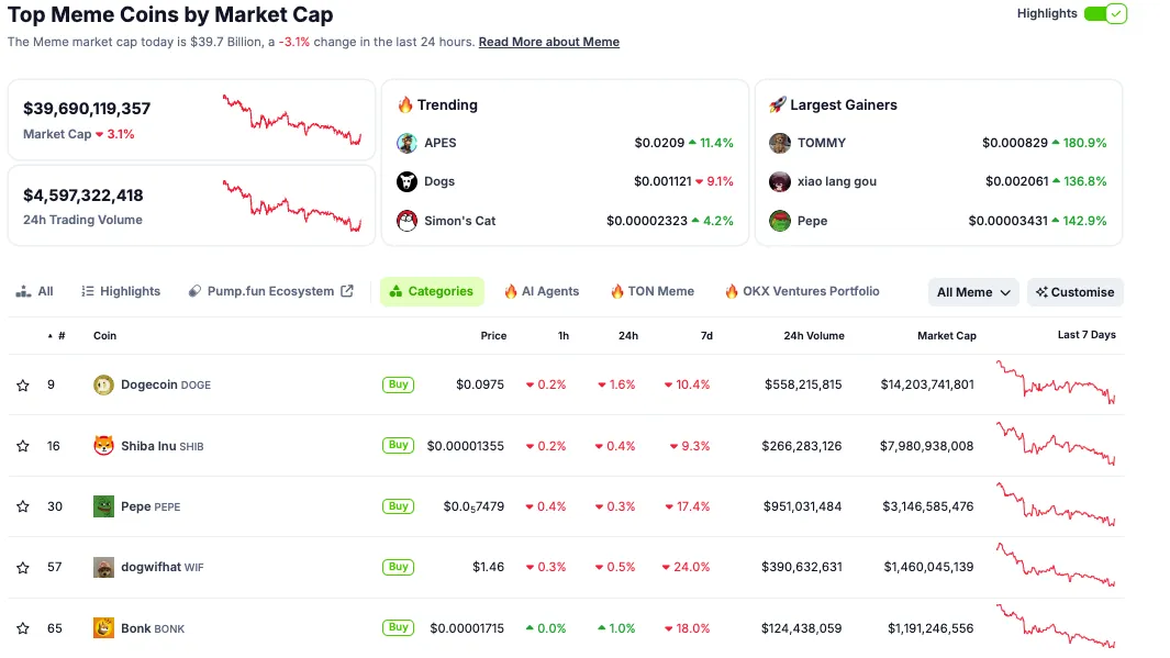 Una vez un componente próspero del ecosistema cripto, el sector de las memecoins ha visto recientemente cómo su capitalización de mercado caía por debajo de los 40 mil millones de dólares. Según CoinGecko, ahora se sitúa en 39.69 mil millones de dólares, lo que marca una disminución del 3% en las últimas 24 horas y más de 12% en la semana anterior.