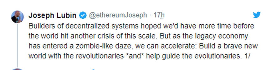 Lubin, que en estos días está al mando de ConsenSys, explicó cómo COVID-19 ha puesto en el foco de atención a los desarrolladores de protocolos descentralizados. Explicó cómo antes de la última crisis económica, él esperaba ver como los bancos centrales “patearan la lata por el camino” durante algún tiempo, refiríendose a retrasar el problema unos años en vez de solucionarlos. Pero la pandemia cambió todo eso.
