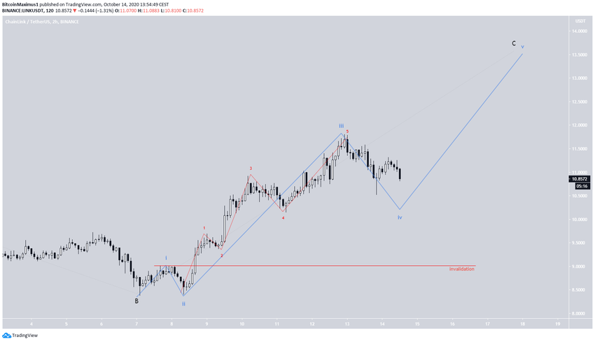 Desde el máximo del 17 de agosto, el precio de LINK posiblemente haya completado una diagonal principal bajista (que se muestra en negro a continuación), que podría haber sido la onda A de una corrección A-B-C (en naranja), actualmente en la onda B.