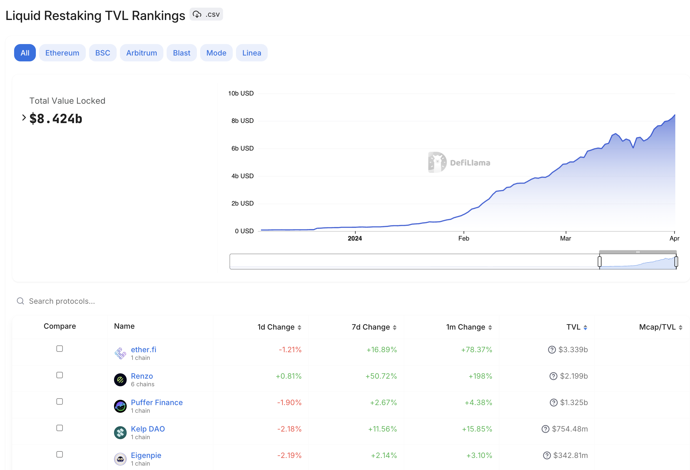 A la cabeza se encuentra EtherFi, que por sí solo cuenta con un TVL superior a los 3,300 millones de dólares. En consecuencia, protocolos como Renzo, Kelp y Puffer también están experimentando un crecimiento sin precedentes.