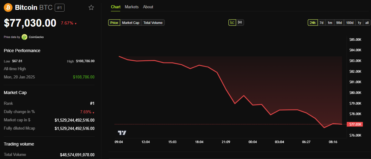 Los datos de BeInCrypto muestran que Bitcoin ha caído casi un 8% en las últimas 24 horas para negociarse a 77,030 dólares al momento de la publicación.